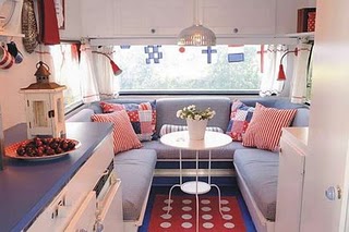 of an adorable red-white-and-blue-camper over at Apple Blossom Dreams. I love it! Now, our camper is a pop-up so I can't change the "walls" because they are actually a vinyl canvas. However, the cabinets, benches and panels are good to go! I dragged Mr. McD down to Lowe's for some paint and painting supplies and got started right away. It took one weekend and one quart of white paint (well, primer with a bit of white paint stirred in). Here it is still in "raw" form; tape and paper and can, but I can already tell I love it. It does make the camper look a bit brighter and cheery!